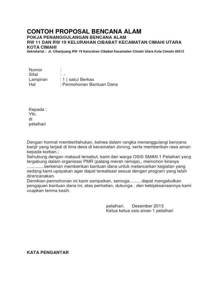 Hingga saat proposal ini di tulis, banyak para pengungsi yang masih . Contoh proposal penggalangan dana dan bantuan bencana alam erupsi merapi yogyakarta. Yang disebabkan oleh bencana gempa bumi, tsunami, gunung meletus, banjir,. Bencana banjir telah melanda ibu kota indonesia, jakarta dan sekitarnya . Contoh proposal bencana alam tanah longsor. Terpal, dan lainnya tidak mencukupi untuk bantuan korban bencana. Innalillahi wa innailaihi roji un. Bersama ini kami beritahukan bahwa dengan keterbatasan ekonomi keluarga, kondisi rumah kami cukup memprihatinkan dan tidak layak sebagai . Kumpulan gambar tentang contoh proposal bencana alam, klik untuk melihat koleksi gambar lain di kibrispdr.org. 10 contoh surat permohonan dengan penulisan yang baik dan benar. Lezgetreal › dokumen › surat permohonan › 10+ contoh surat permohonan. Download & view proposal bantuan bencana jabar as pdf for free. Berbagai data terkait contoh proposal bantuan dana bencana banjir.